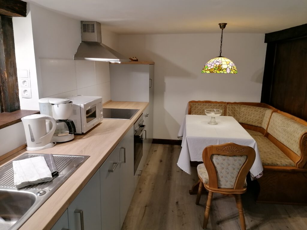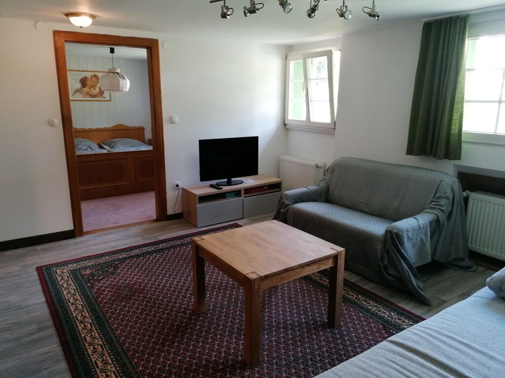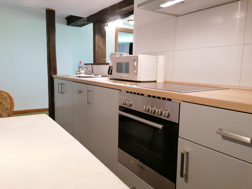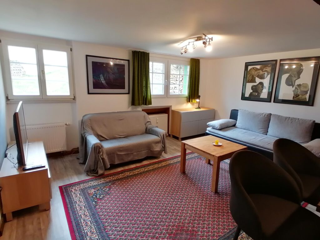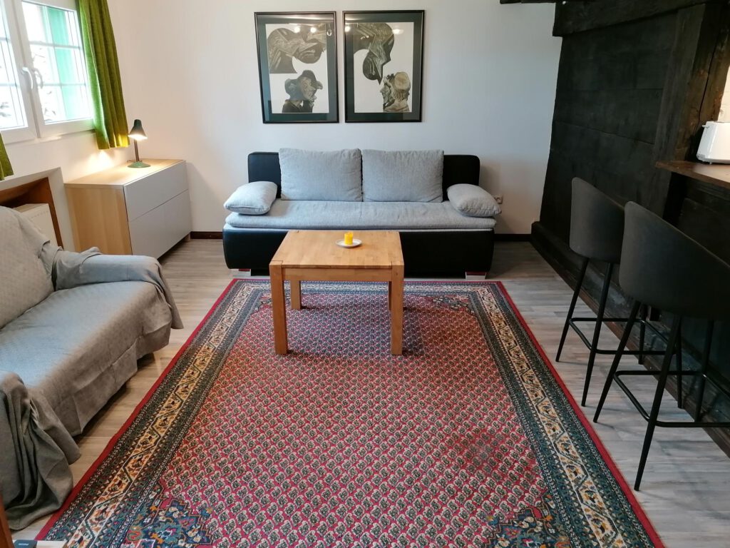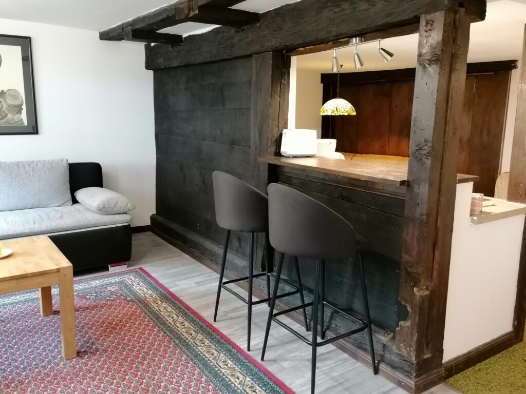 Unsere Stube im 1. OG haben wir gerade renoviert und dabei ein paar uralte Balken freigelegt, die der Wohnung die zusammen mit moderner Ausstattung einen besonderen Charme verleihen.